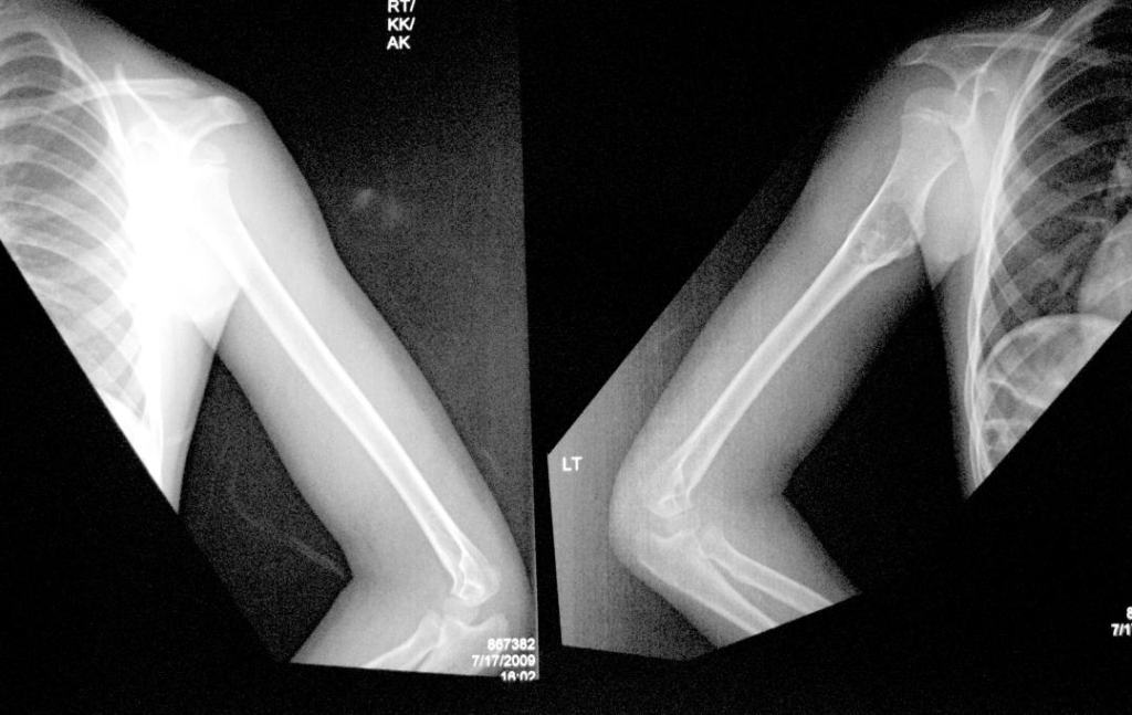 Shows a bony swelling over upper third of the arm bone humerus of the left side Features BENIGN SESSILE tumour (non-pedunculated)