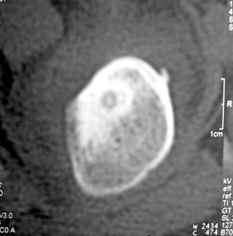 CT showed the typical nidus in the center of a transluscent lesion in the same region of increased density – OSTEOID OSTEOMA (Benign bony tumor)